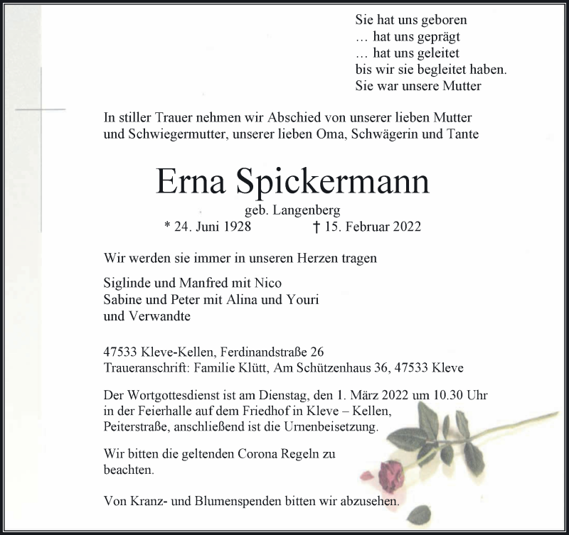 Hier finden Sie alle Traueranzeigen aus der Zeitung, die bisher für Erna Spickermann erschienen sind. Weitere Traueranzeigen, die in der Zeitung erscheinen, werden hier ebenfalls aufgelistet