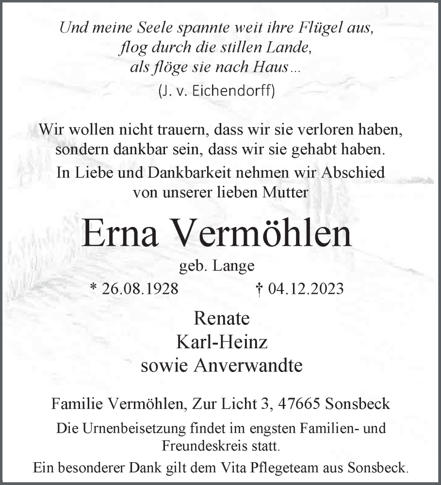 Hier finden Sie alle Traueranzeigen aus der Zeitung, die bisher für Erna Vermöhlen erschienen sind. Weitere Traueranzeigen, die in der Zeitung erscheinen, werden hier ebenfalls aufgelistet
