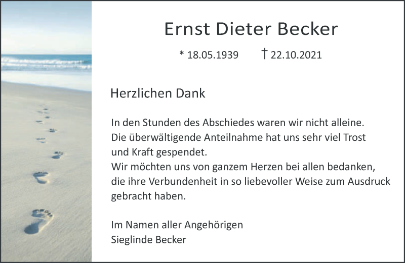 Hier finden Sie alle Traueranzeigen aus der Zeitung, die bisher für Ernst Dieter Becker erschienen sind. Weitere Traueranzeigen, die in der Zeitung erscheinen, werden hier ebenfalls aufgelistet