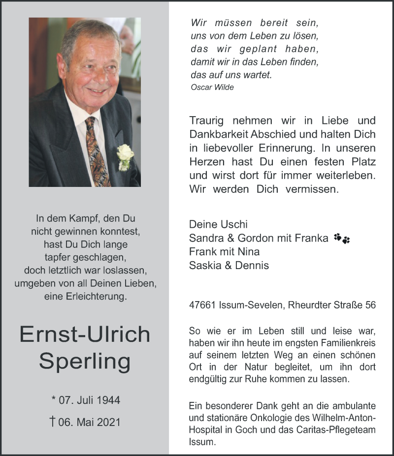Hier finden Sie alle Traueranzeigen aus der Zeitung, die bisher für Ernst-Ulrich Sperling erschienen sind. Weitere Traueranzeigen, die in der Zeitung erscheinen, werden hier ebenfalls aufgelistet