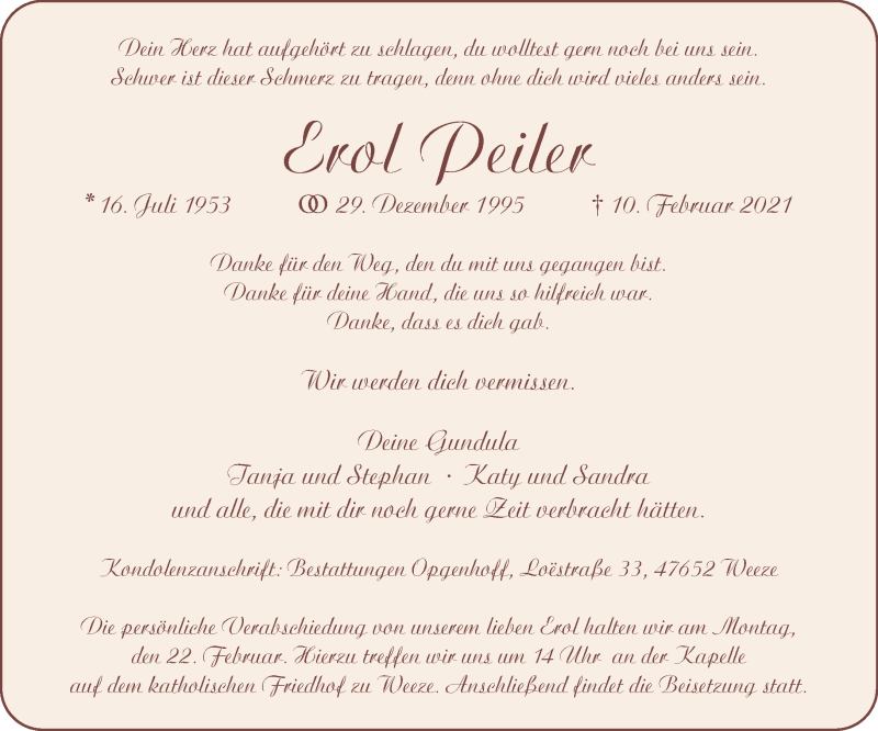 Hier finden Sie alle Traueranzeigen aus der Zeitung, die bisher für Erol Peiler erschienen sind. Weitere Traueranzeigen, die in der Zeitung erscheinen, werden hier ebenfalls aufgelistet