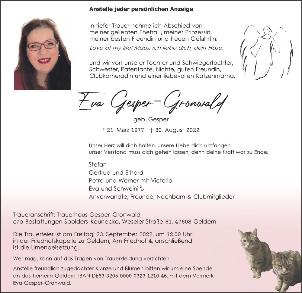 Hier finden Sie alle Traueranzeigen aus der Zeitung, die bisher für Eva Gesper-Gronwald erschienen sind. Weitere Traueranzeigen, die in der Zeitung erscheinen, werden hier ebenfalls aufgelistet