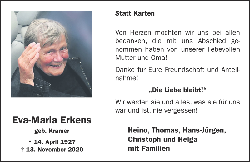 Hier finden Sie alle Traueranzeigen aus der Zeitung, die bisher für Eva-Maria Erkens erschienen sind. Weitere Traueranzeigen, die in der Zeitung erscheinen, werden hier ebenfalls aufgelistet