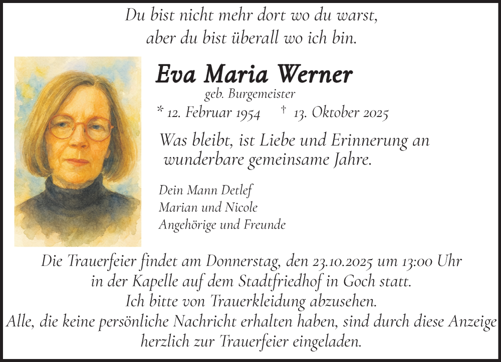 Hier finden Sie alle Traueranzeigen aus der Zeitung, die bisher für Eva Maria Werner erschienen sind. Weitere Traueranzeigen, die in der Zeitung erscheinen, werden hier ebenfalls aufgelistet