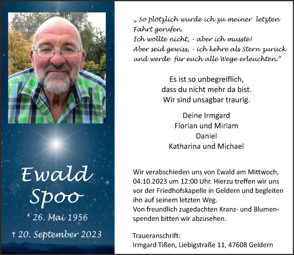 Hier finden Sie alle Traueranzeigen aus der Zeitung, die bisher für Ewald Spoo erschienen sind. Weitere Traueranzeigen, die in der Zeitung erscheinen, werden hier ebenfalls aufgelistet