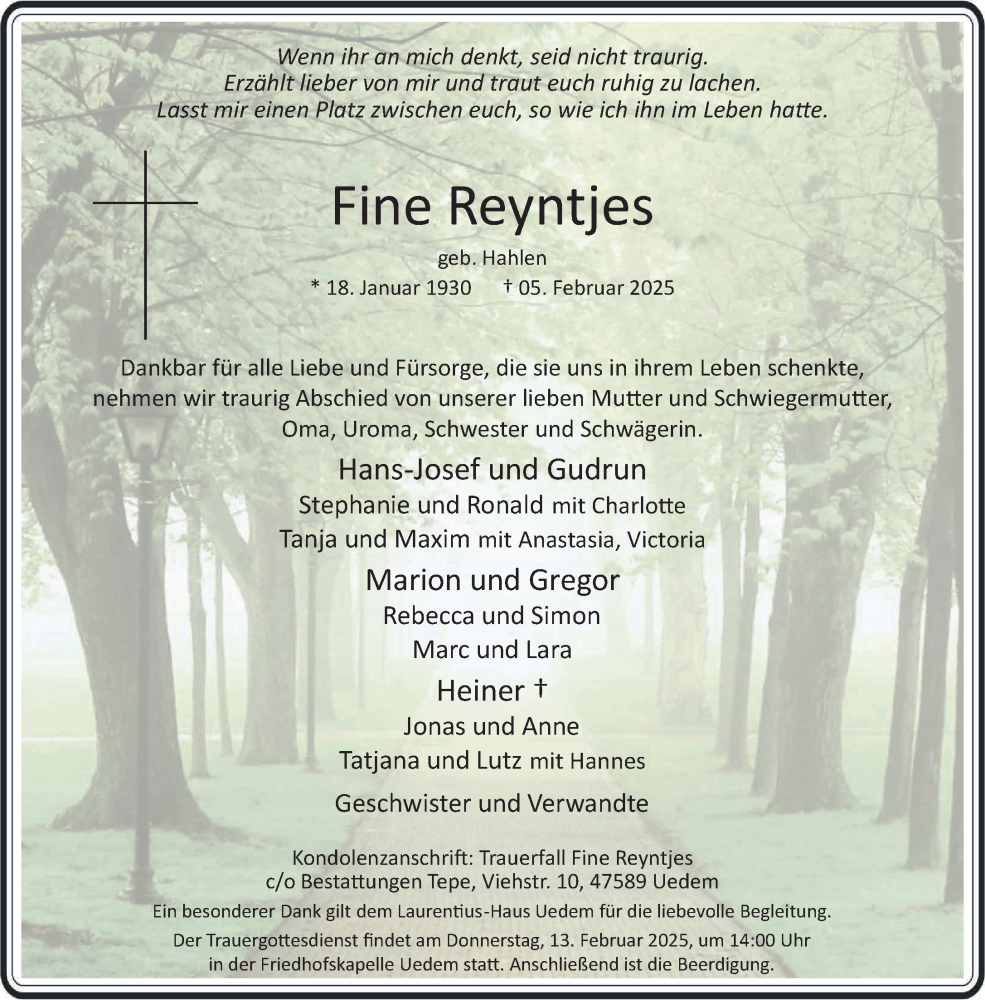 Hier finden Sie alle Traueranzeigen aus der Zeitung, die bisher für Fine Reyntjes erschienen sind. Weitere Traueranzeigen, die in der Zeitung erscheinen, werden hier ebenfalls aufgelistet