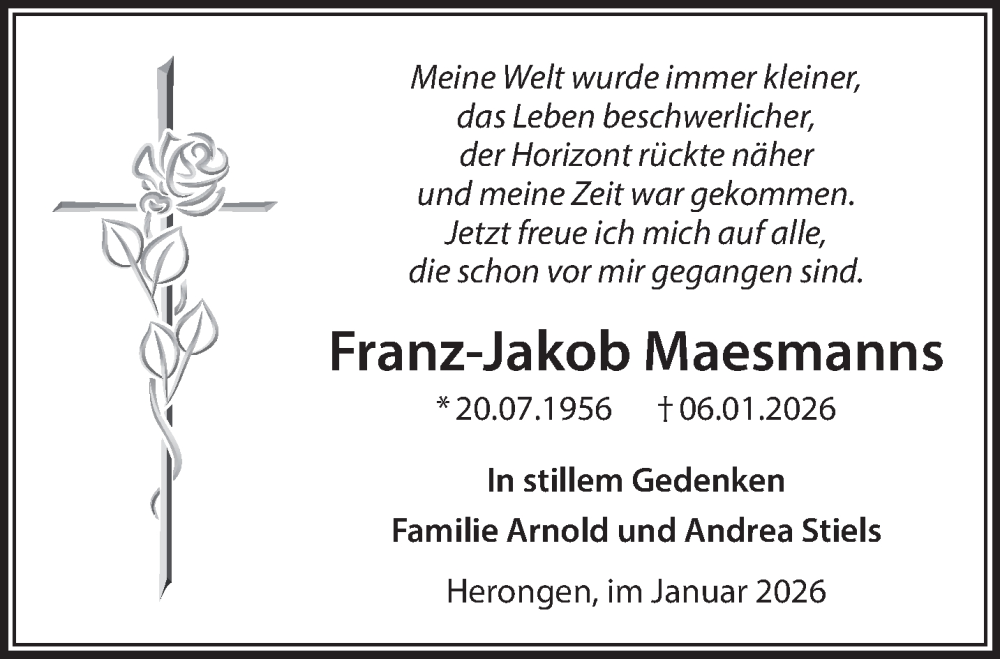 Hier finden Sie alle Traueranzeigen aus der Zeitung, die bisher für Franz-Jakob Maesmanns erschienen sind. Weitere Traueranzeigen, die in der Zeitung erscheinen, werden hier ebenfalls aufgelistet