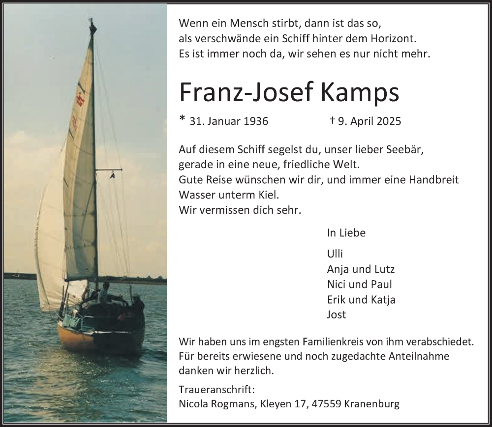 Hier finden Sie alle Traueranzeigen aus der Zeitung, die bisher für Franz-Josef Kamps erschienen sind. Weitere Traueranzeigen, die in der Zeitung erscheinen, werden hier ebenfalls aufgelistet