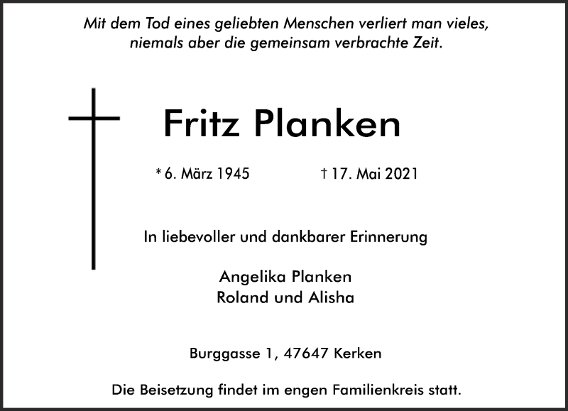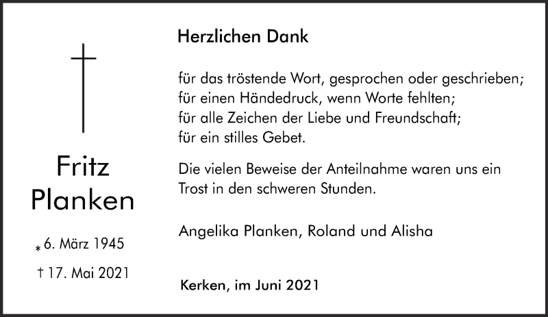 Hier finden Sie alle Traueranzeigen aus der Zeitung, die bisher für Fritz Planken erschienen sind. Weitere Traueranzeigen, die in der Zeitung erscheinen, werden hier ebenfalls aufgelistet