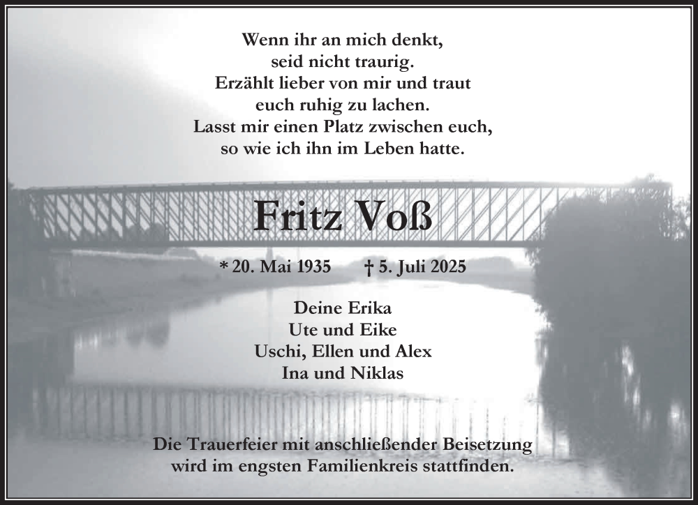 Hier finden Sie alle Traueranzeigen aus der Zeitung, die bisher für Fritz Voß erschienen sind. Weitere Traueranzeigen, die in der Zeitung erscheinen, werden hier ebenfalls aufgelistet