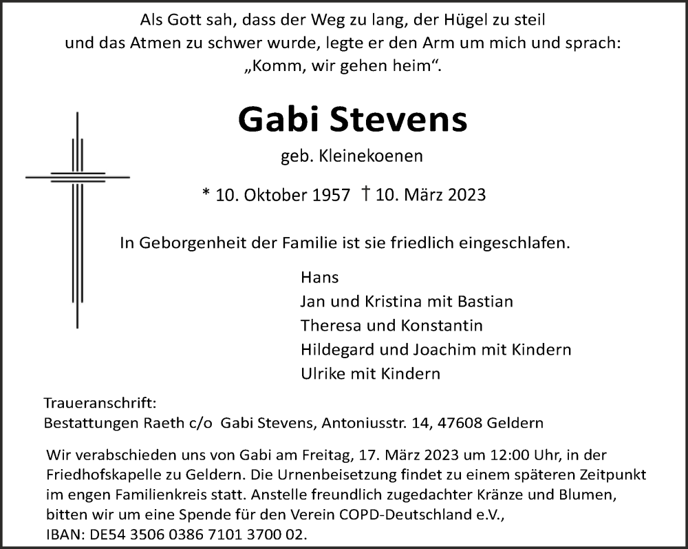 Hier finden Sie alle Traueranzeigen aus der Zeitung, die bisher für Gabi Stevens erschienen sind. Weitere Traueranzeigen, die in der Zeitung erscheinen, werden hier ebenfalls aufgelistet
