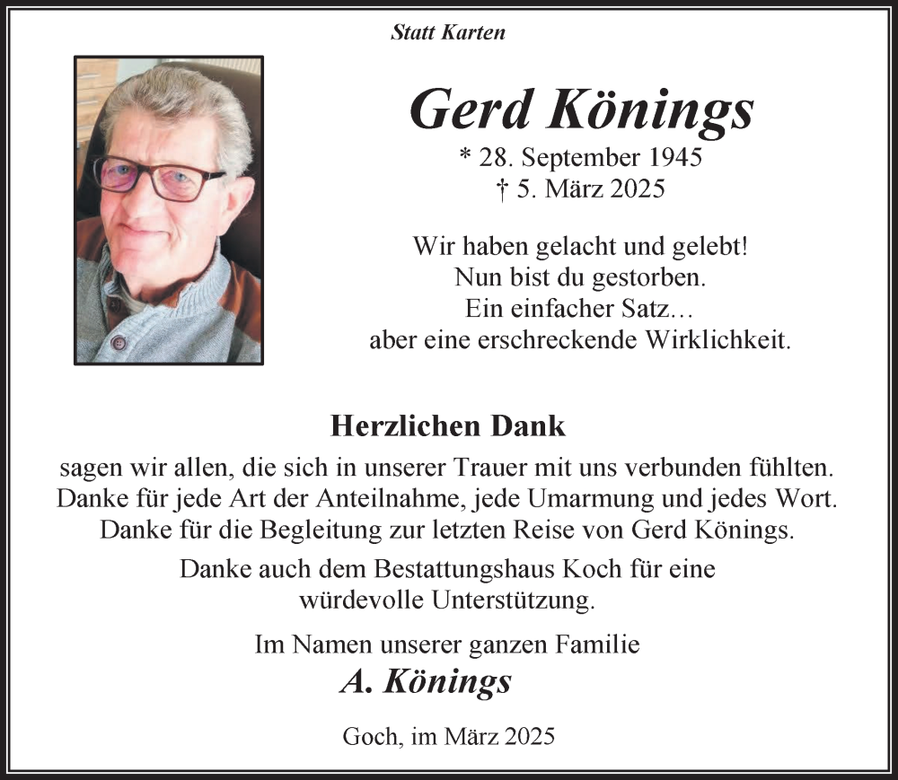 Hier finden Sie alle Traueranzeigen aus der Zeitung, die bisher für Gerd Könings erschienen sind. Weitere Traueranzeigen, die in der Zeitung erscheinen, werden hier ebenfalls aufgelistet