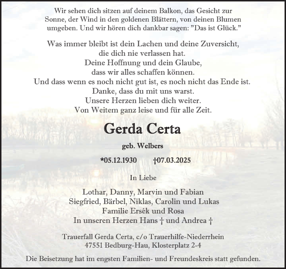 Hier finden Sie alle Traueranzeigen aus der Zeitung, die bisher für Gerda Certa erschienen sind. Weitere Traueranzeigen, die in der Zeitung erscheinen, werden hier ebenfalls aufgelistet
