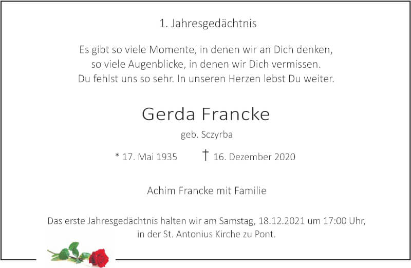 Hier finden Sie alle Traueranzeigen aus der Zeitung, die bisher für Gerda Francke erschienen sind. Weitere Traueranzeigen, die in der Zeitung erscheinen, werden hier ebenfalls aufgelistet