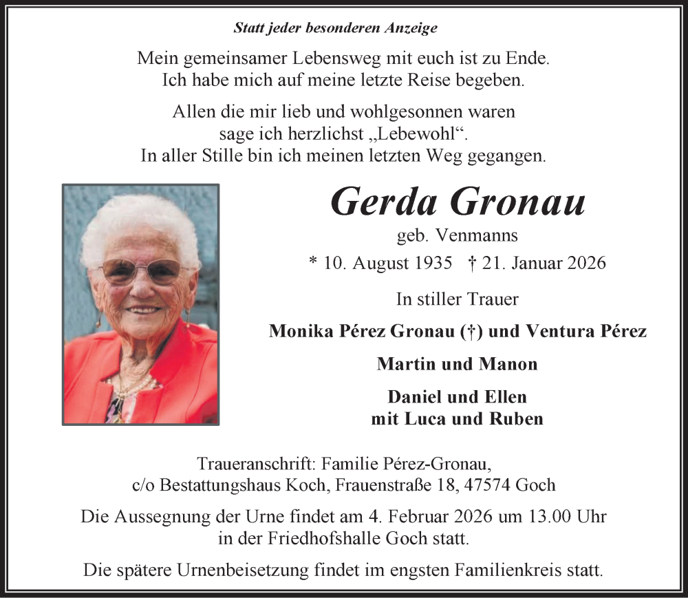 Hier finden Sie alle Traueranzeigen aus der Zeitung, die bisher für Gerda Gronau erschienen sind. Weitere Traueranzeigen, die in der Zeitung erscheinen, werden hier ebenfalls aufgelistet