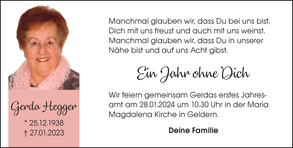 Hier finden Sie alle Traueranzeigen aus der Zeitung, die bisher für Gerda Hegger erschienen sind. Weitere Traueranzeigen, die in der Zeitung erscheinen, werden hier ebenfalls aufgelistet