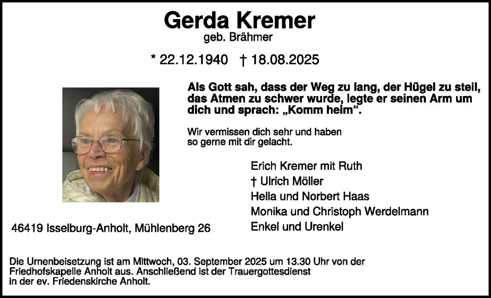 Hier finden Sie alle Traueranzeigen aus der Zeitung, die bisher für Gerda Kremer erschienen sind. Weitere Traueranzeigen, die in der Zeitung erscheinen, werden hier ebenfalls aufgelistet