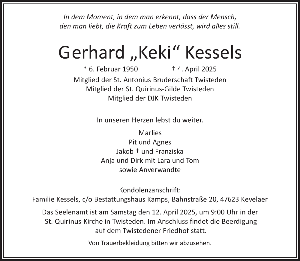 Hier finden Sie alle Traueranzeigen aus der Zeitung, die bisher für Gerhard Kessels erschienen sind. Weitere Traueranzeigen, die in der Zeitung erscheinen, werden hier ebenfalls aufgelistet