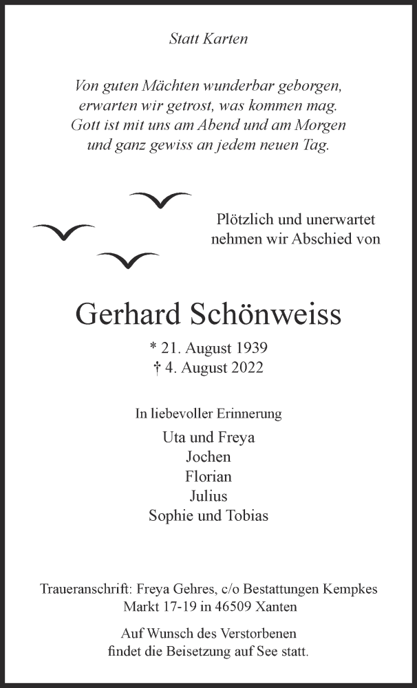 Hier finden Sie alle Traueranzeigen aus der Zeitung, die bisher für Gerhard Schönweiss erschienen sind. Weitere Traueranzeigen, die in der Zeitung erscheinen, werden hier ebenfalls aufgelistet