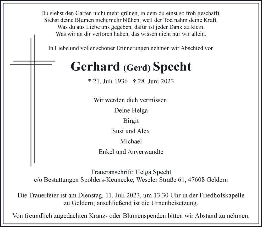 Hier finden Sie alle Traueranzeigen aus der Zeitung, die bisher für Gerhard Specht erschienen sind. Weitere Traueranzeigen, die in der Zeitung erscheinen, werden hier ebenfalls aufgelistet