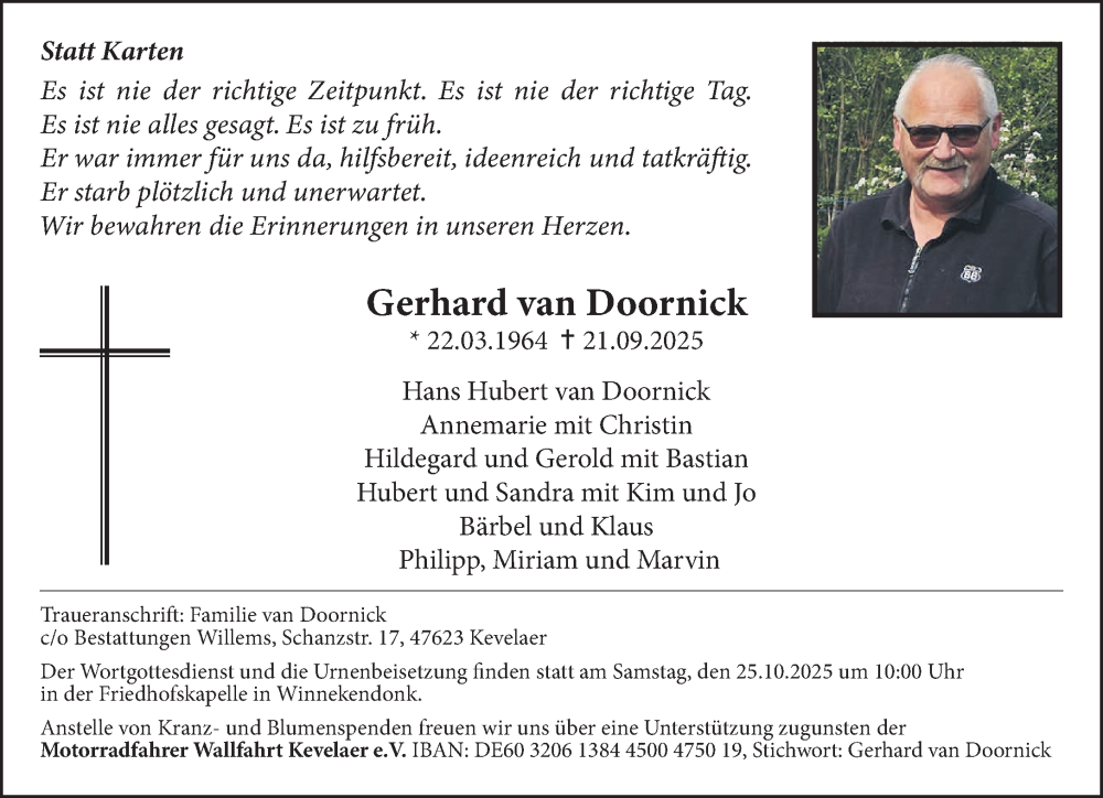 Hier finden Sie alle Traueranzeigen aus der Zeitung, die bisher für Gerhard van Doornick erschienen sind. Weitere Traueranzeigen, die in der Zeitung erscheinen, werden hier ebenfalls aufgelistet