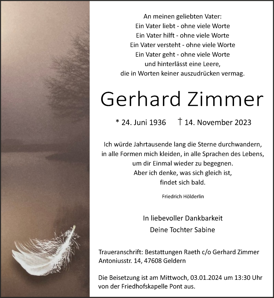 Hier finden Sie alle Traueranzeigen aus der Zeitung, die bisher für Gerhard Zimmer erschienen sind. Weitere Traueranzeigen, die in der Zeitung erscheinen, werden hier ebenfalls aufgelistet