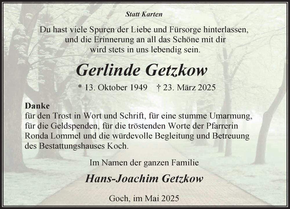 Hier finden Sie alle Traueranzeigen aus der Zeitung, die bisher für Gerlinde Getzkow erschienen sind. Weitere Traueranzeigen, die in der Zeitung erscheinen, werden hier ebenfalls aufgelistet