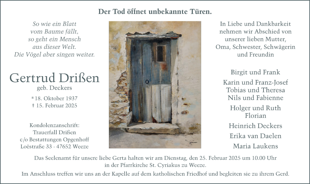 Hier finden Sie alle Traueranzeigen aus der Zeitung, die bisher für Gertrud Drißen erschienen sind. Weitere Traueranzeigen, die in der Zeitung erscheinen, werden hier ebenfalls aufgelistet