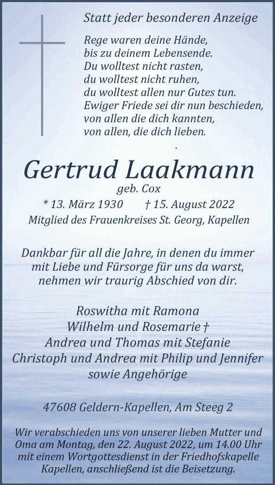 Hier finden Sie alle Traueranzeigen aus der Zeitung, die bisher für Gertrud Laakmann erschienen sind. Weitere Traueranzeigen, die in der Zeitung erscheinen, werden hier ebenfalls aufgelistet