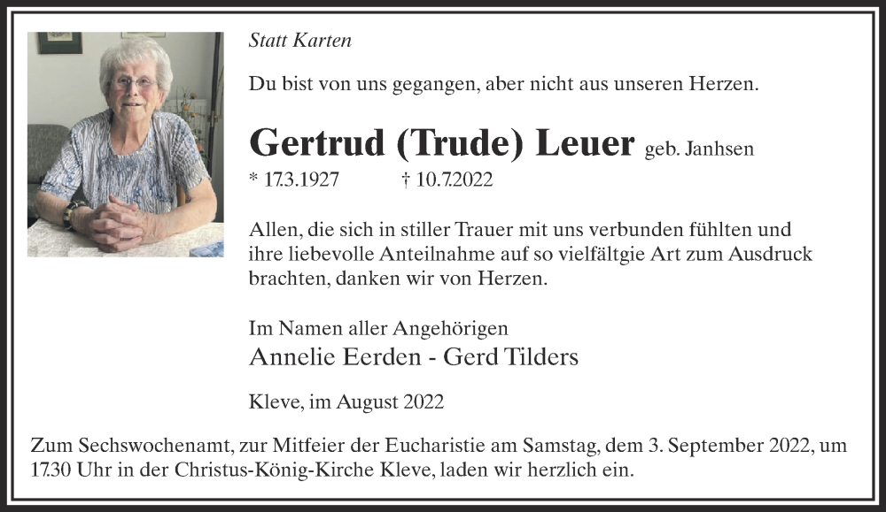 Hier finden Sie alle Traueranzeigen aus der Zeitung, die bisher für Gertrud Leuer erschienen sind. Weitere Traueranzeigen, die in der Zeitung erscheinen, werden hier ebenfalls aufgelistet