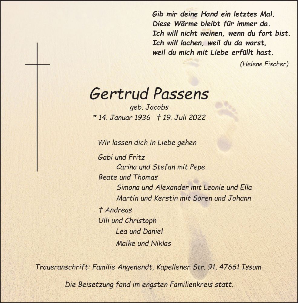 Hier finden Sie alle Traueranzeigen aus der Zeitung, die bisher für Gertrud Possens erschienen sind. Weitere Traueranzeigen, die in der Zeitung erscheinen, werden hier ebenfalls aufgelistet