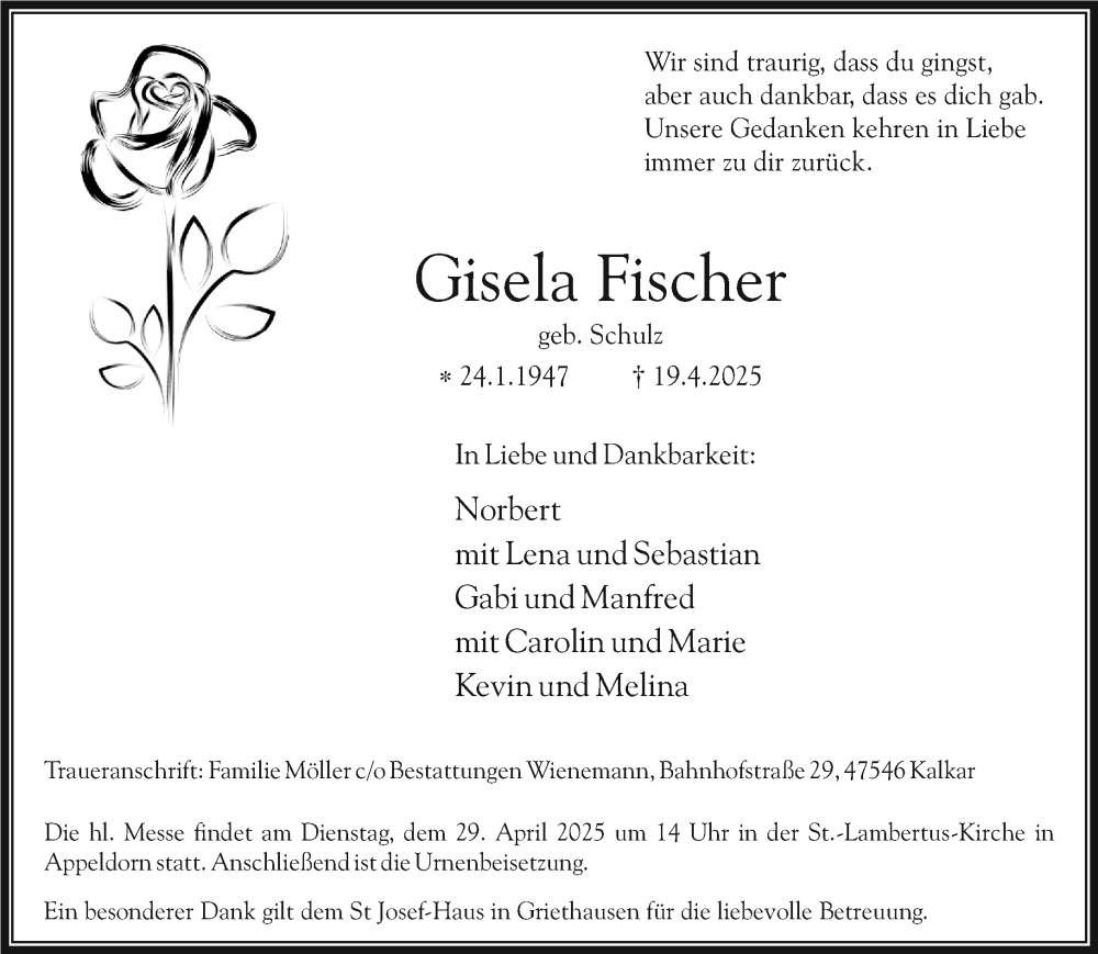 Hier finden Sie alle Traueranzeigen aus der Zeitung, die bisher für Gisela Fischer erschienen sind. Weitere Traueranzeigen, die in der Zeitung erscheinen, werden hier ebenfalls aufgelistet