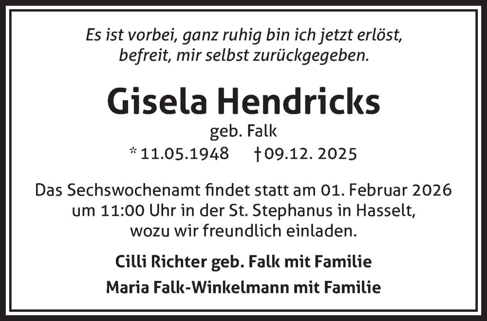 Hier finden Sie alle Traueranzeigen aus der Zeitung, die bisher für Gisela Hendricks erschienen sind. Weitere Traueranzeigen, die in der Zeitung erscheinen, werden hier ebenfalls aufgelistet