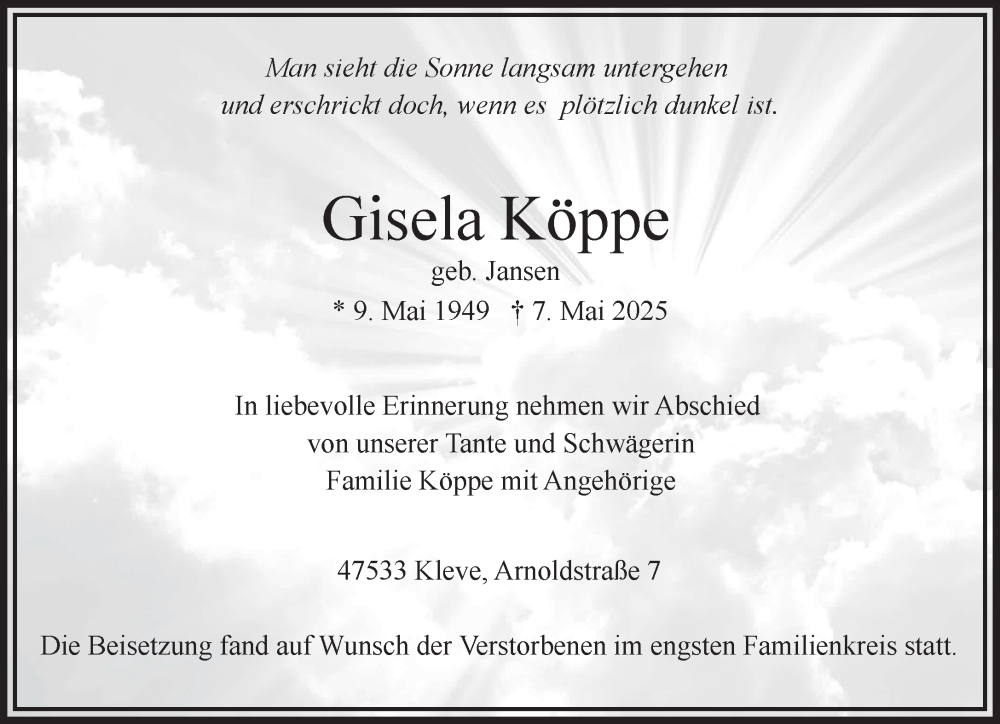 Hier finden Sie alle Traueranzeigen aus der Zeitung, die bisher für Gisela Köppe erschienen sind. Weitere Traueranzeigen, die in der Zeitung erscheinen, werden hier ebenfalls aufgelistet