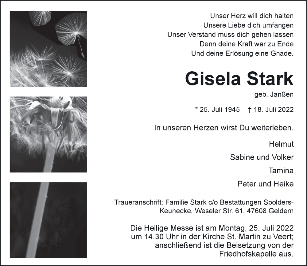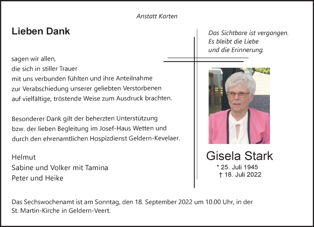 Hier finden Sie alle Traueranzeigen aus der Zeitung, die bisher für Gisela Stark erschienen sind. Weitere Traueranzeigen, die in der Zeitung erscheinen, werden hier ebenfalls aufgelistet