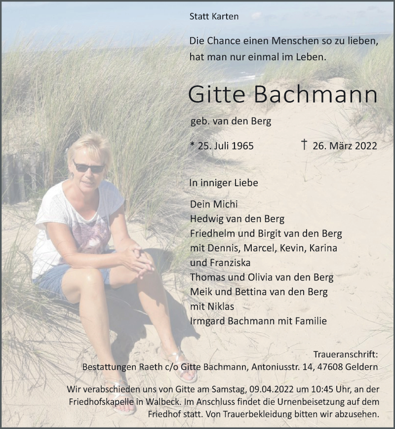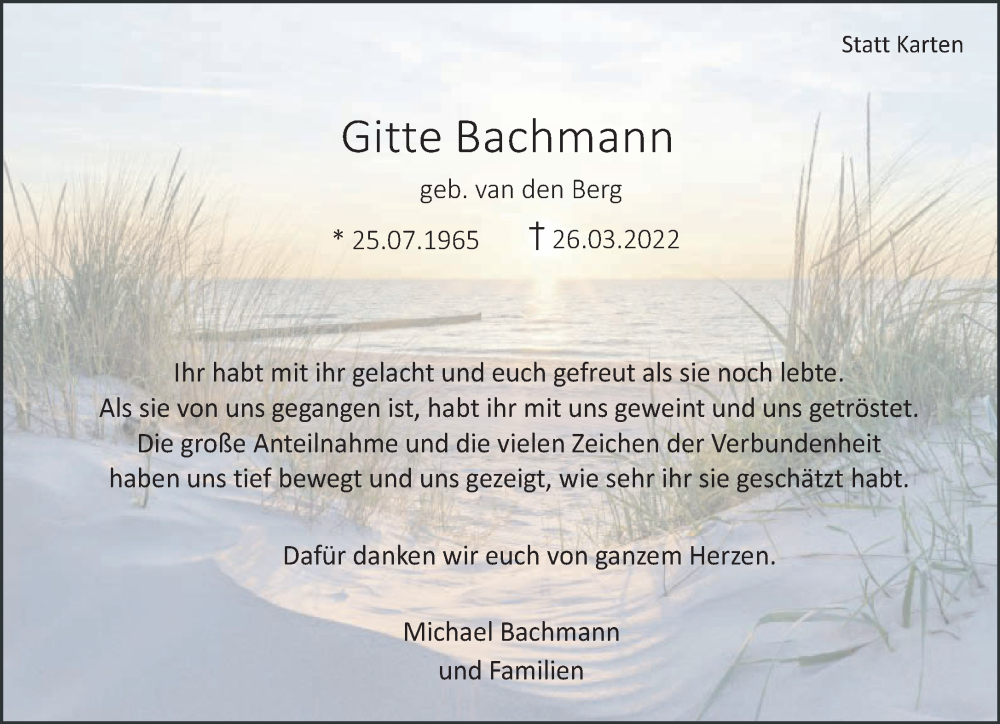 Hier finden Sie alle Traueranzeigen aus der Zeitung, die bisher für Gitte Bachmann erschienen sind. Weitere Traueranzeigen, die in der Zeitung erscheinen, werden hier ebenfalls aufgelistet