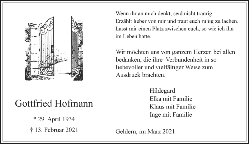 Hier finden Sie alle Traueranzeigen aus der Zeitung, die bisher für Gottfried Hofmann erschienen sind. Weitere Traueranzeigen, die in der Zeitung erscheinen, werden hier ebenfalls aufgelistet