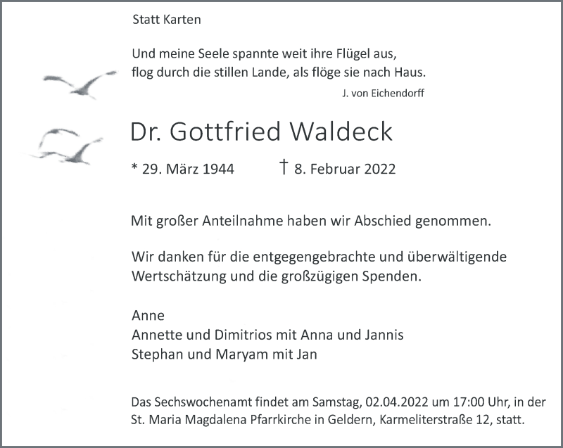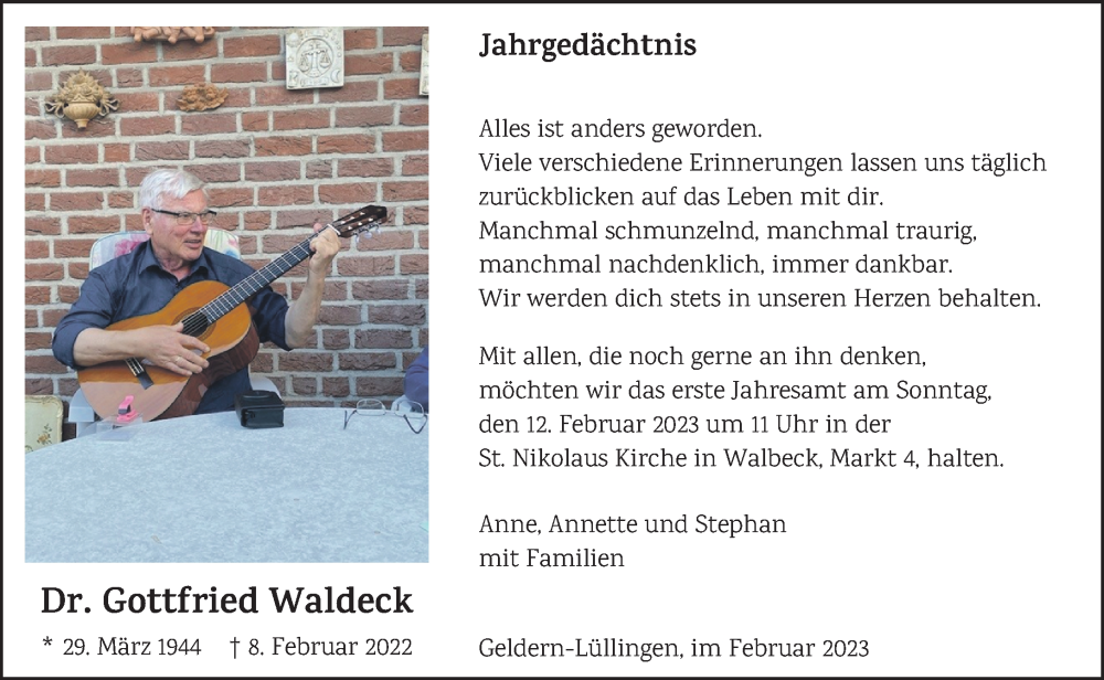 Hier finden Sie alle Traueranzeigen aus der Zeitung, die bisher für Gottfried Waldeck erschienen sind. Weitere Traueranzeigen, die in der Zeitung erscheinen, werden hier ebenfalls aufgelistet