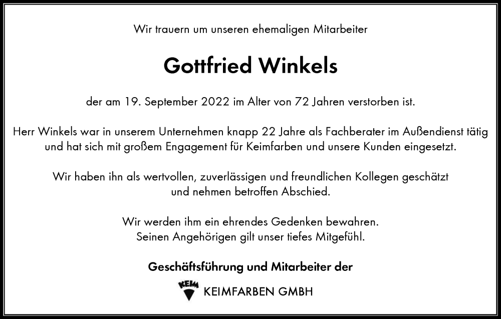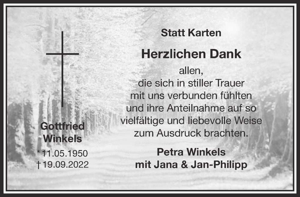 Hier finden Sie alle Traueranzeigen aus der Zeitung, die bisher für Gottfried Winkels erschienen sind. Weitere Traueranzeigen, die in der Zeitung erscheinen, werden hier ebenfalls aufgelistet