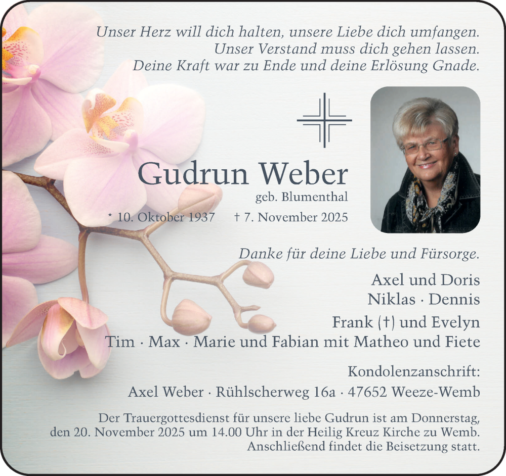 Hier finden Sie alle Traueranzeigen aus der Zeitung, die bisher für Gudrun Weber erschienen sind. Weitere Traueranzeigen, die in der Zeitung erscheinen, werden hier ebenfalls aufgelistet