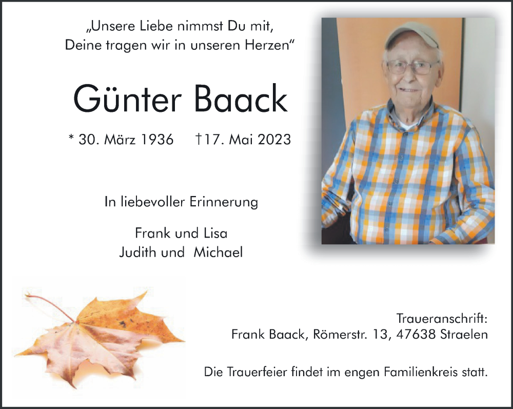 Hier finden Sie alle Traueranzeigen aus der Zeitung, die bisher für Günter Baack erschienen sind. Weitere Traueranzeigen, die in der Zeitung erscheinen, werden hier ebenfalls aufgelistet