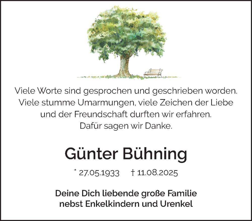 Hier finden Sie alle Traueranzeigen aus der Zeitung, die bisher für Günter Bühning erschienen sind. Weitere Traueranzeigen, die in der Zeitung erscheinen, werden hier ebenfalls aufgelistet