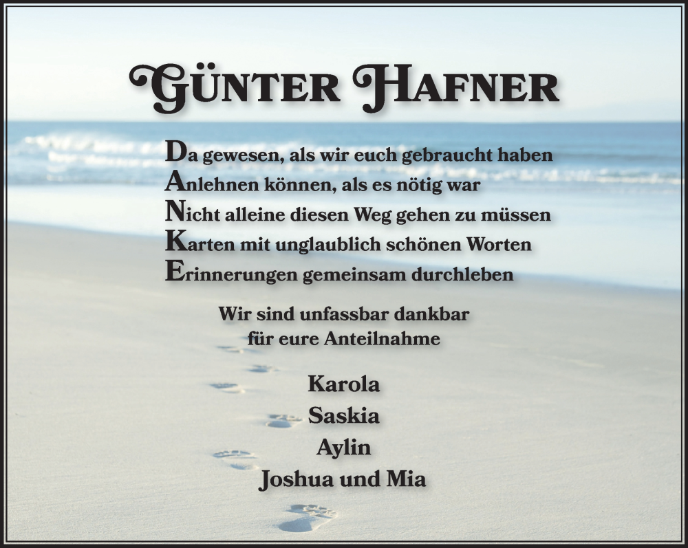 Hier finden Sie alle Traueranzeigen aus der Zeitung, die bisher für Günter Hafner erschienen sind. Weitere Traueranzeigen, die in der Zeitung erscheinen, werden hier ebenfalls aufgelistet
