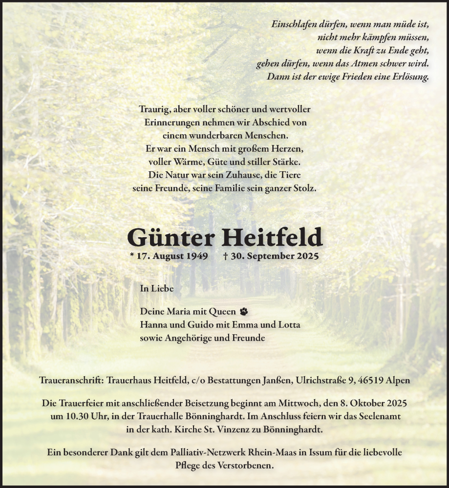 Hier finden Sie alle Traueranzeigen aus der Zeitung, die bisher für Günter Heitfeld erschienen sind. Weitere Traueranzeigen, die in der Zeitung erscheinen, werden hier ebenfalls aufgelistet