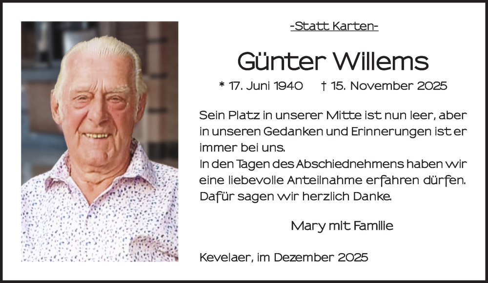 Hier finden Sie alle Traueranzeigen aus der Zeitung, die bisher für Günter Willems erschienen sind. Weitere Traueranzeigen, die in der Zeitung erscheinen, werden hier ebenfalls aufgelistet