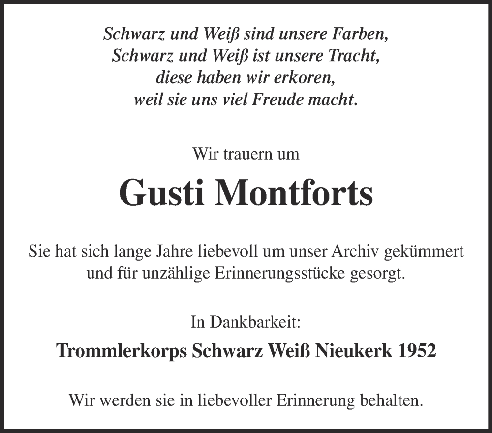 Hier finden Sie alle Traueranzeigen aus der Zeitung, die bisher für Gusti Montforts erschienen sind. Weitere Traueranzeigen, die in der Zeitung erscheinen, werden hier ebenfalls aufgelistet