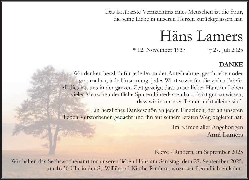 Hier finden Sie alle Traueranzeigen aus der Zeitung, die bisher für Häns Lamers erschienen sind. Weitere Traueranzeigen, die in der Zeitung erscheinen, werden hier ebenfalls aufgelistet