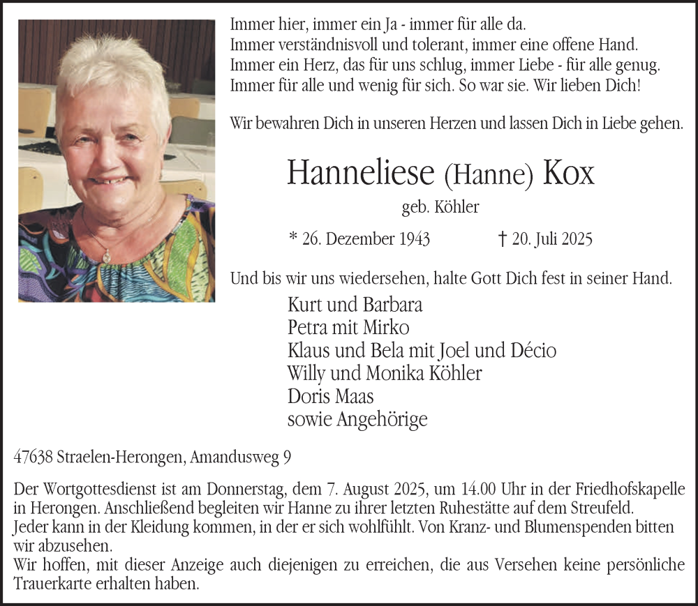 Hier finden Sie alle Traueranzeigen aus der Zeitung, die bisher für Hanneliese Kox erschienen sind. Weitere Traueranzeigen, die in der Zeitung erscheinen, werden hier ebenfalls aufgelistet