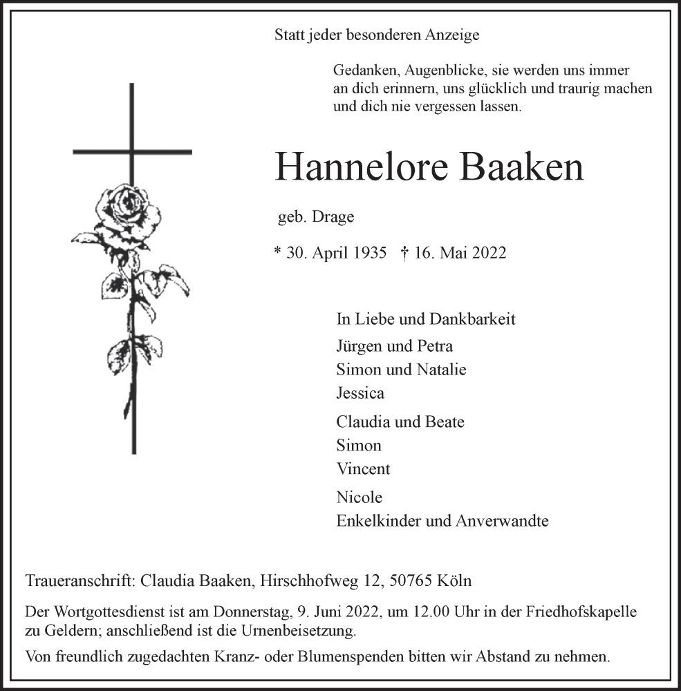 Hier finden Sie alle Traueranzeigen aus der Zeitung, die bisher für Hannelore Baaken erschienen sind. Weitere Traueranzeigen, die in der Zeitung erscheinen, werden hier ebenfalls aufgelistet