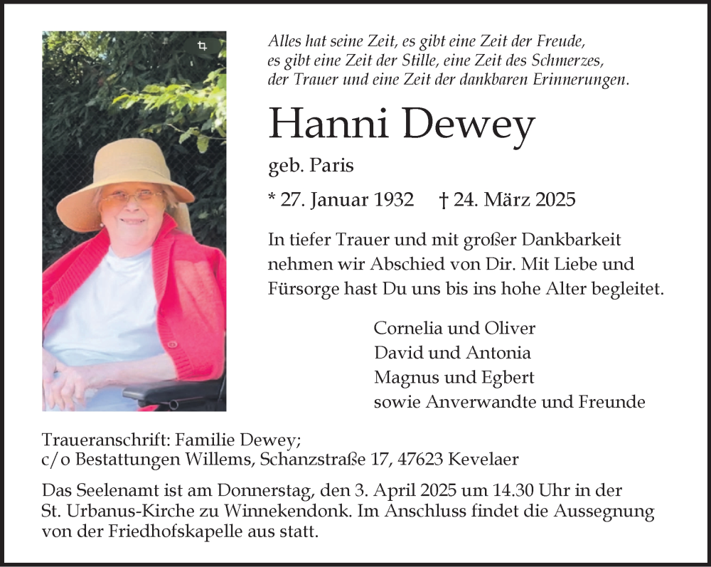 Hier finden Sie alle Traueranzeigen aus der Zeitung, die bisher für Hanni Dewey erschienen sind. Weitere Traueranzeigen, die in der Zeitung erscheinen, werden hier ebenfalls aufgelistet